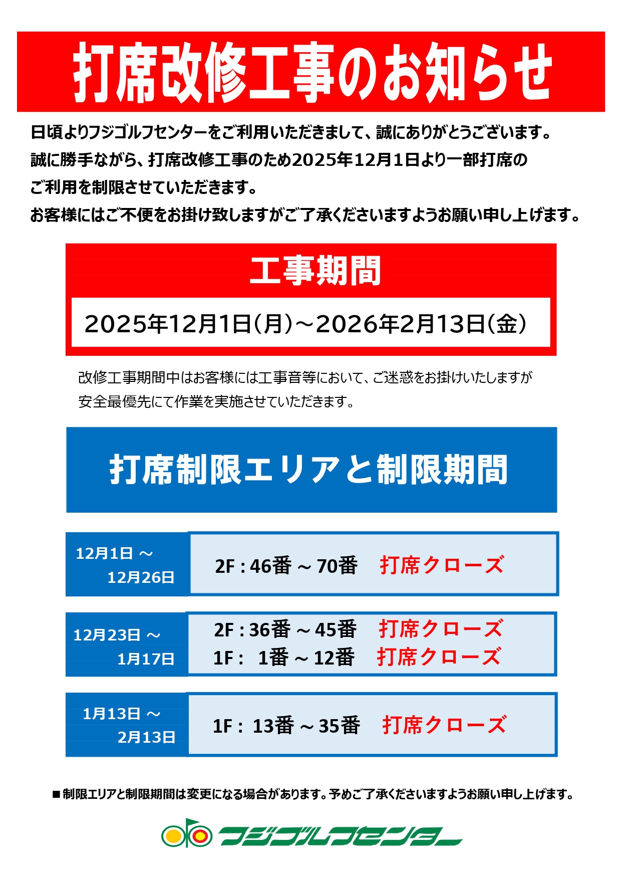 誠に勝手ながら、打席改修工事のため2025年12月1日より一部打席のご利用を制限させていただきます。