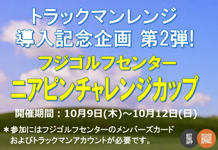 ニュース トラックマンレンジ導入記念キャンペーン第2弾10月9日(木)~10月12日(日)の4日間、トラックマンレンジを使用したニアピン大会を開催します。入賞者された方には当センターでご利用可能なポイントを進呈いたします。参加は無料です。ぜひチャレンジしてくださーい。*フジゴルフセンターのメンバー登録とトラックマンアプリアカウント登録が必須です。 詳細はこちらをタップしてご確認ください。